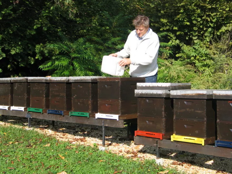 Družinam dodajamo nekaj več kot liter tekočine, pri tem pa pazimo, da sirupa ne razlivamo okoli stojišča ali po panjih. Čebele krmimo s sladkorno raztopino vsak drugi dan, in to toliko časa, dokler niso dovolj nakrmljene. Upoštevati moramo, da čebelja družina od oktobra do maja prihodnjega leta porabi približno 12 kg hrane, to pa je tudi minimalna količina, ki jim jo moramo dodati za prezimitev. V nakladnem panju normalne velikosti naj bo torej od 15-18 kg zimske zaloge hrane. Pri zimskem krmljenju je priporočljivo, da si zapisujemo, koliko raztopine smo dodali, kajti če bo zimske zidoge preveč, čebelja družina ne bo imela prostora za oblikovanje zimskega gnezda.