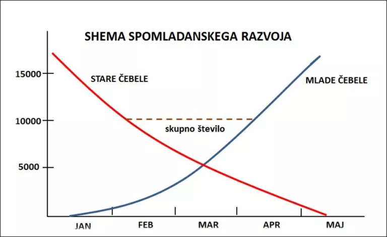 Od normalnega poteka širjenja gnezda je odvisno, ali se bo v panju v večjem ali manjšem obsegu pojavila spomladanska kriza. Jeseni izvaljene čebele odmirajo, nadomeščajo pa jih mlade čebele. To lahko ponazorimo z grafom. Rdeča krivulja, ki ponazarja število starih čebel, se od konca januarja do začetka aprila počasi spušča. Modra krivulja, ki ponazarja mlade čebele, pa od februarja naprej raste. V času, ko se krivulji sekata, je v panju najmanjše število čebel, zato ta trenutek imenujemo kritična točka v panju. Kritično obdobje se pri nas pojavlja približno na prehodu iz marca v april. Čim pozneje se pojavi kritično obdobje, tem manj prizadene razvoj družin. To krizo nekoliko omilimo, če številčno oslabelo družino utesnimo na prostor, ki ga lahko zaseda.